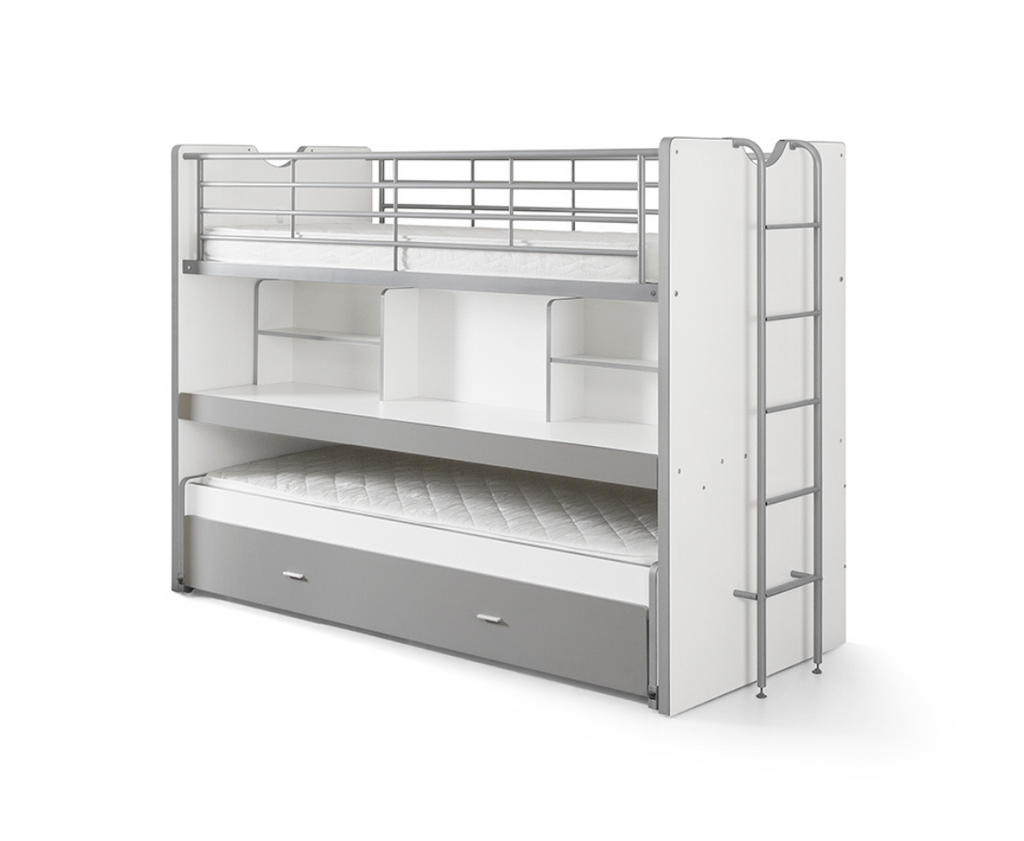 Bonnie loft bed silver. The slatted base is included. This space-saving bed consists of two beds, a trundle bed, and a desk. The ladder can be mounted on either side. The desk, lower bed, and trundle bed are extendable.