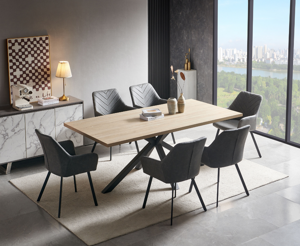 Krista Oak Heat & Scratch resistant  Table with 6 microfibre Dark Grey chairs & black legs.