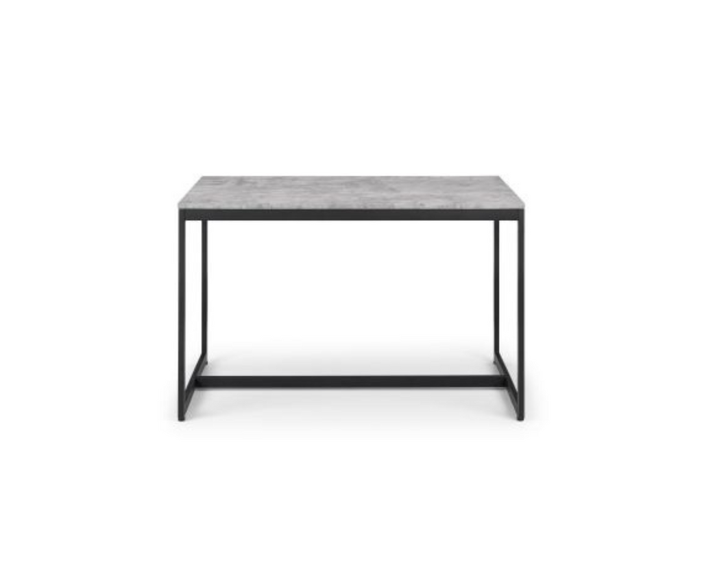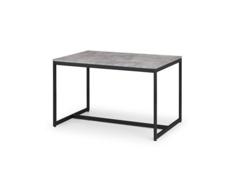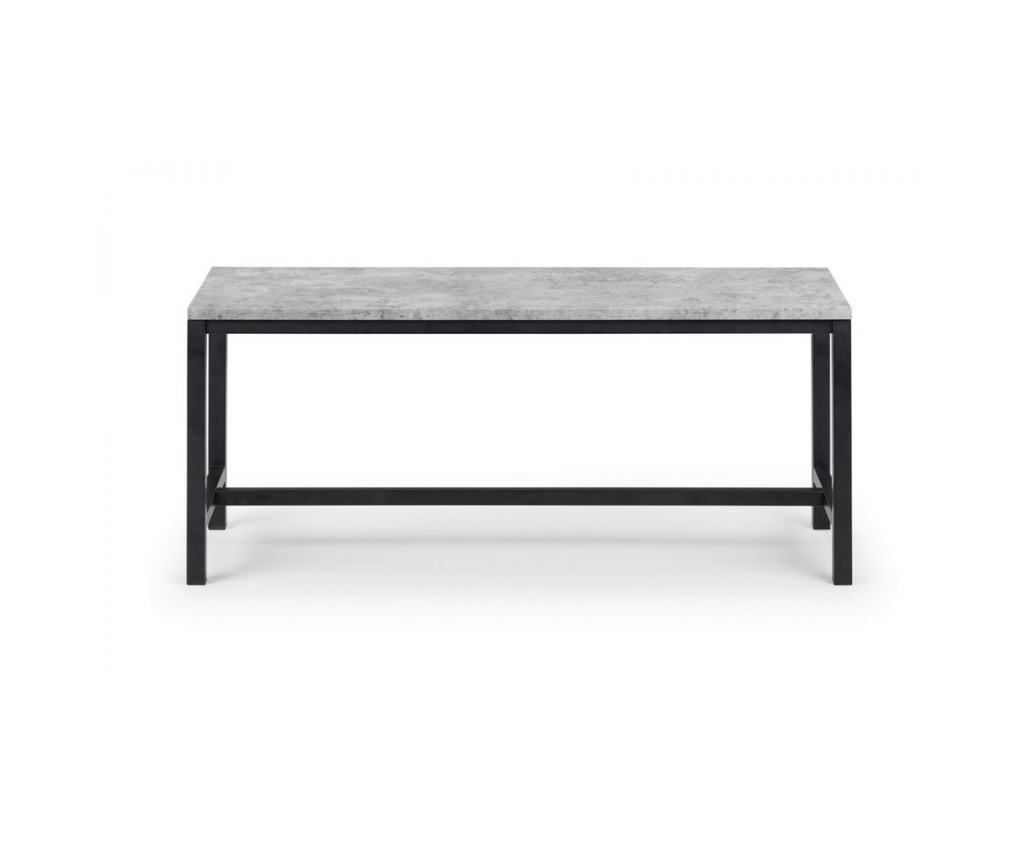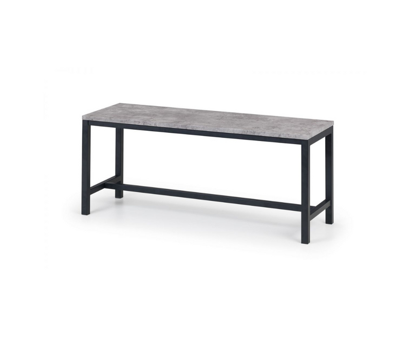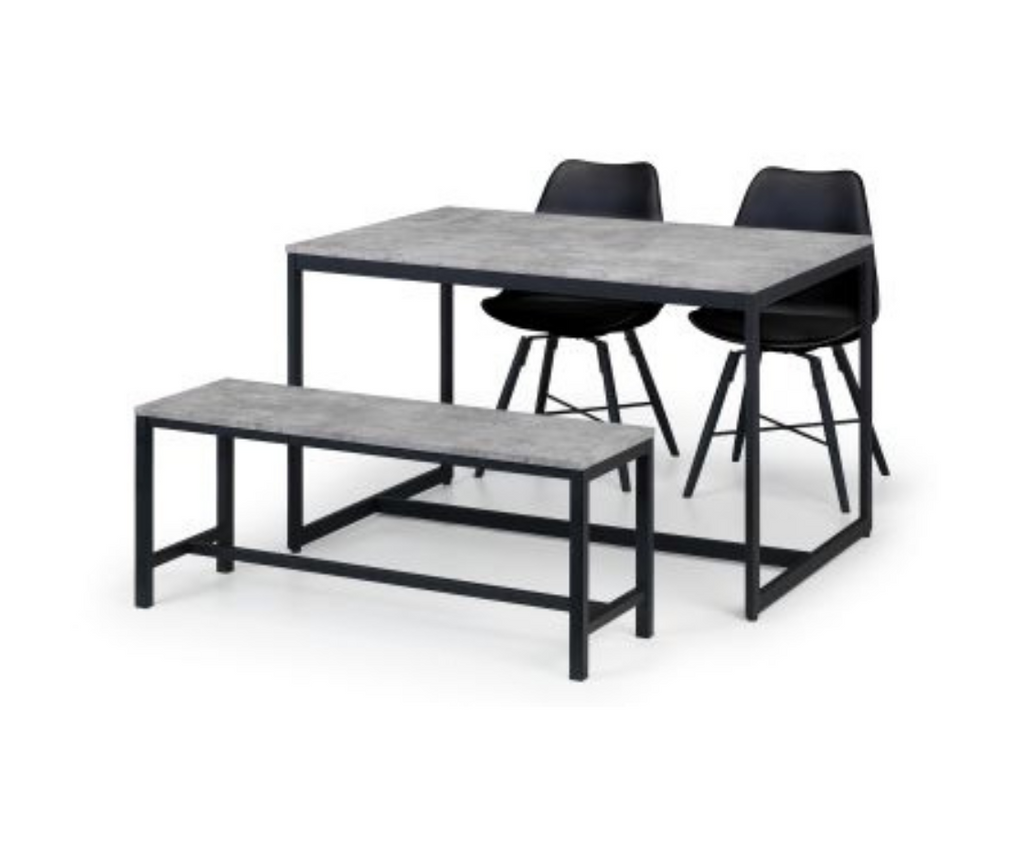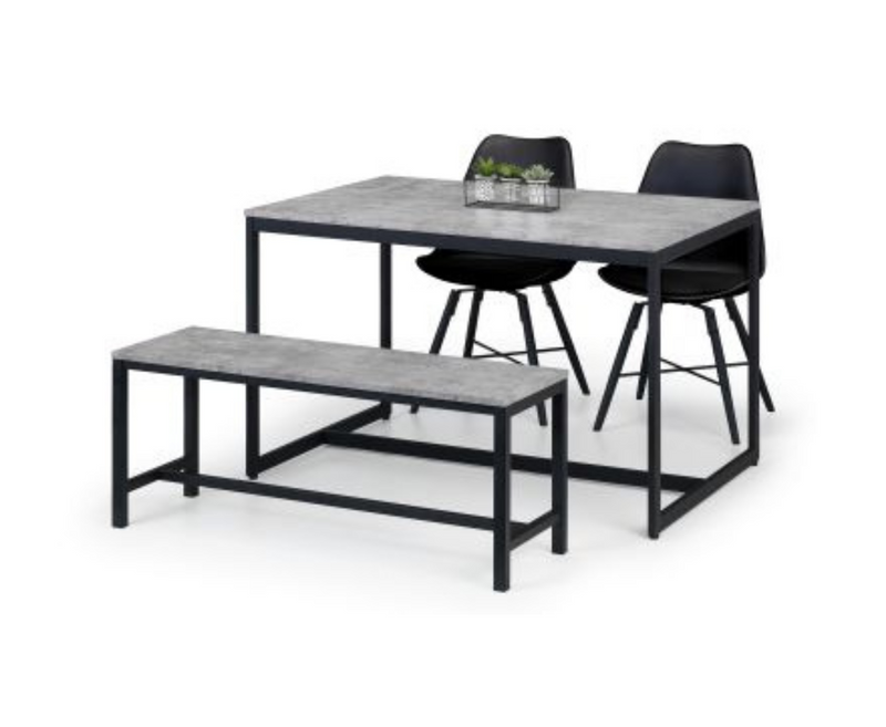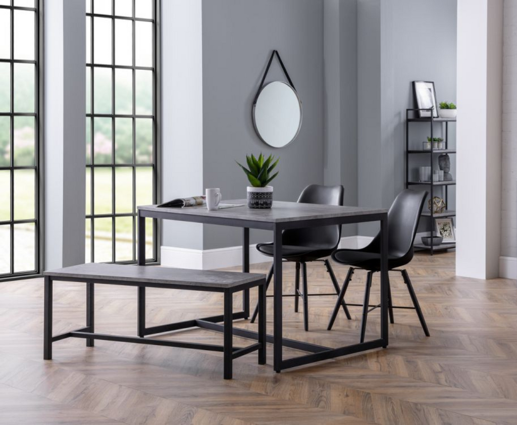 Simplistic in design with a contemporary style, the Perth dining table will add a stunning industrial look to any living and dining area. Constructed from a black coated metal frame, complemented by a striking concrete effect tops, to create a very stylish, modern product. Featured with the Perth bench and 2 Kari grey dining chairs. The Kari Dining Chair features a curved design that conforms to the natural curve of the spine, paired with a high-quality padded seat allowing you to reach maximum comfort.  Featuring a black, easily-cleaned seat and black legs, with an steel cross bar giving this chair a modern industrial feel.