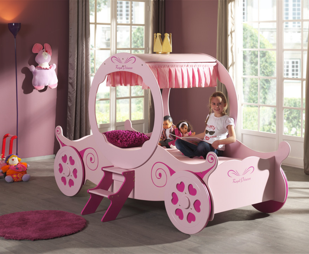 This ROYAL PRINCESS KATE bed is made of pink lacquered MDF. It's shaped like a carriage with two steps. A slatted base is included and is suitable for a 90x200cm mattress