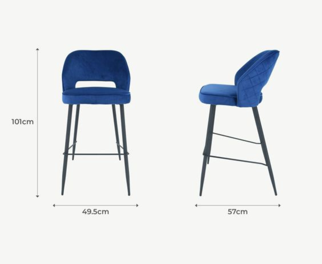 This stunning bar stool that is upholstered in ribbed and diamond quilted pattern gives a character of luxury to these dining chairs. This chair is Available in Mustard, Navy or Grey velvet, with a combined design with metal legs and material gives the user maximum comfort and stability.