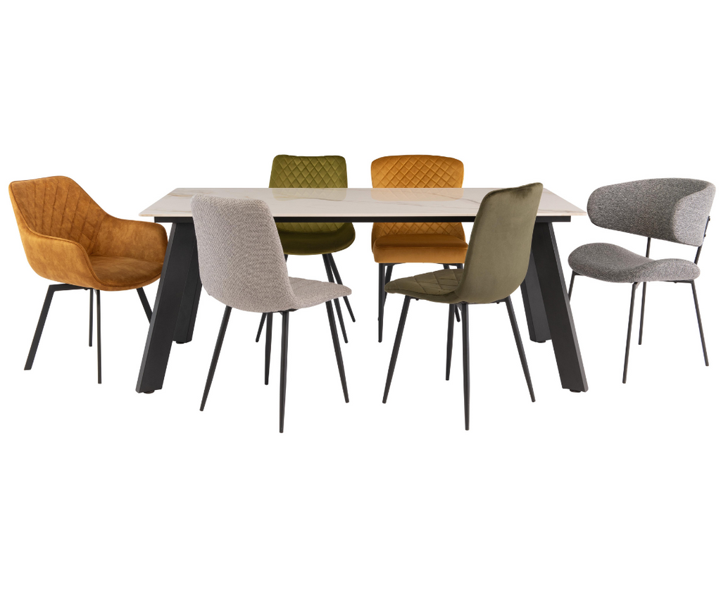 The art of contemporary luxury. Exquisitely tailored in stunning velvet fabric with chequered pattern design and piping detail. Uniquely shaped black powder-coated legs deliver the final designer touch.