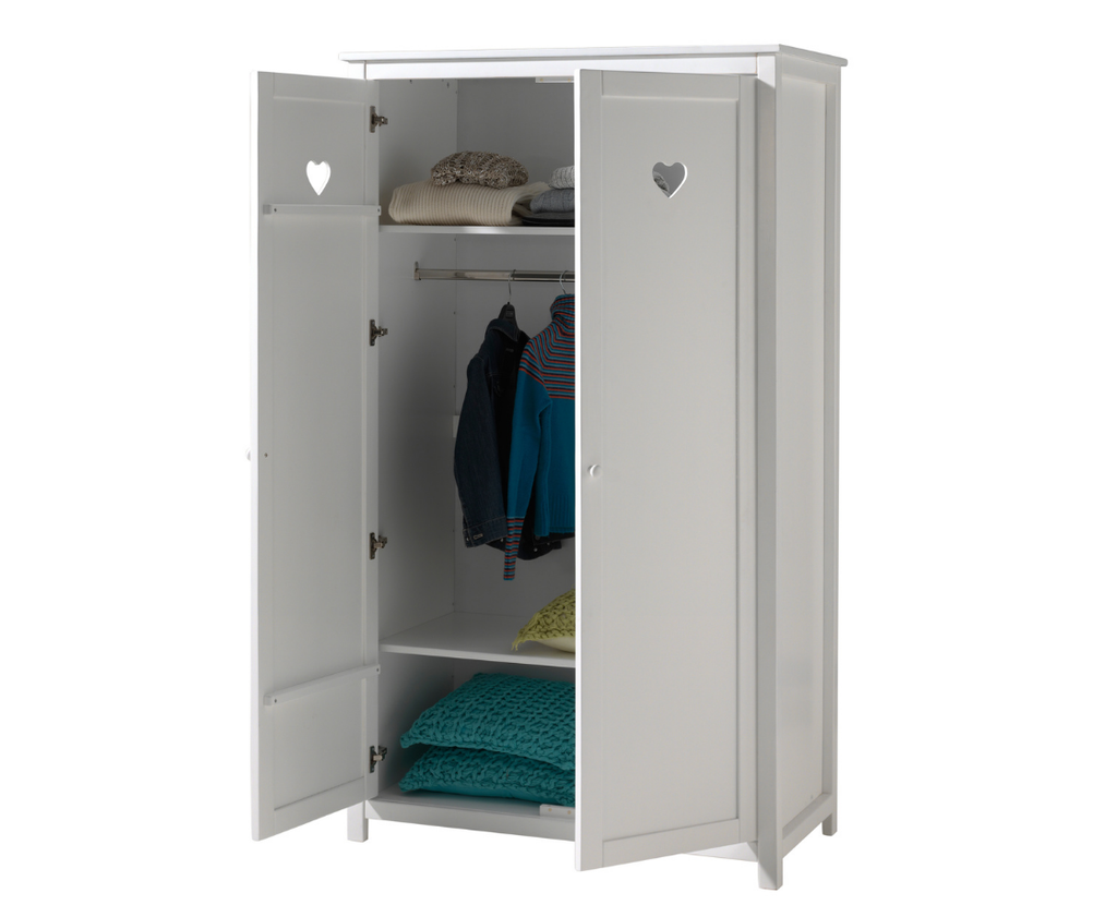 The two-door white wardrobe combines a timeless, fresh design with soft, romantic accents. It's a favorite room for anyone who appreciates elegant furniture. The wardrobe offers ample storage space and includes two shelves and a clothes rail. This provides ample space for clothes, bed linens, and more. Let yourself be seduced by the charm of this room with its heart-shaped detail.