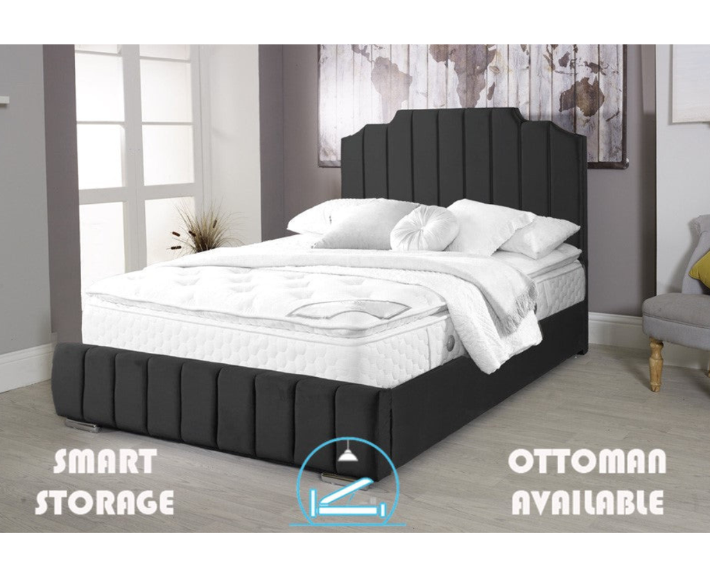Our Art Deco Ottoman Bed Frame With an Exquisite Stepped Designed Headboard & Matching Footboard Taking Inspiration From The Classic Art deco period with Features Like Luxuriously Padded, Panels & Stepped Design Each Panel Is Individually Upholstered To Create This Fluted Panel Styled Bed with the luxury of a full storage ottoman to store all you need.