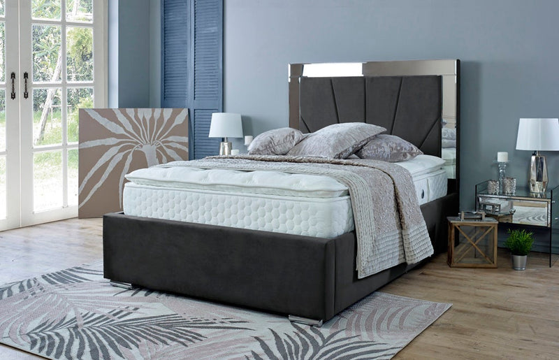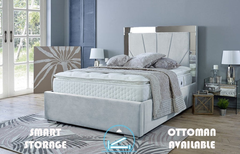 Our Exclusive Aurora Ottoman Bed Frame Is Part Of Our New La Glance Mirrored Bed Frame Range With An Exquisite Inlayed Mirrored Panel & Luxuriously Panelled Headboard The Aurora Takes Inspiration From The Classic Art Deco Period Of Exploration In Design Each Panel Is Individually Upholstered To The Highest Standards To Create This Timeless Styled Bed Frame *Also Available With An Ottoman Option, See Our Ottoman Beds For More*