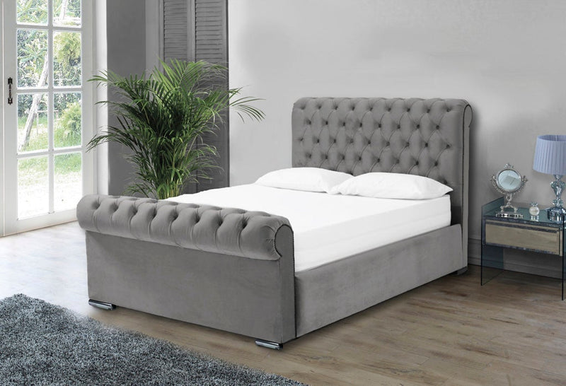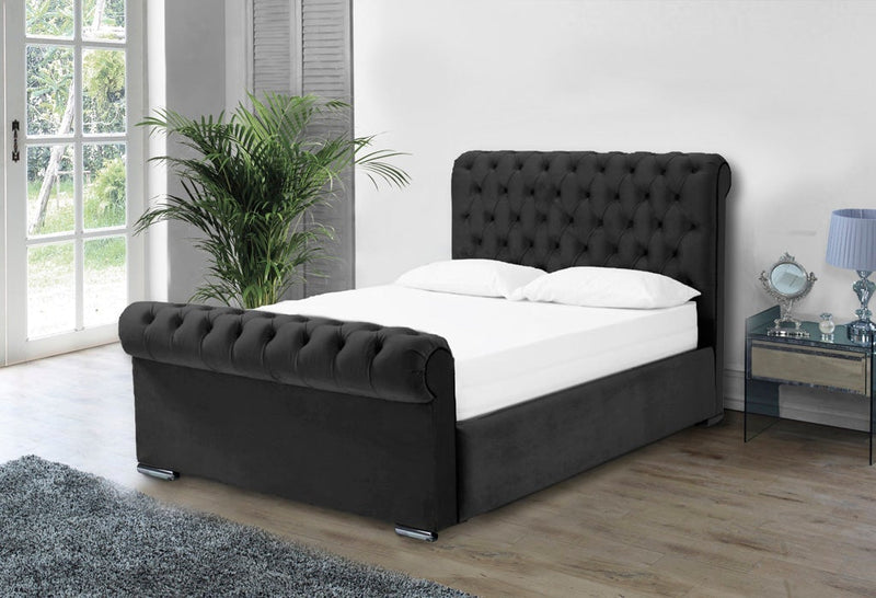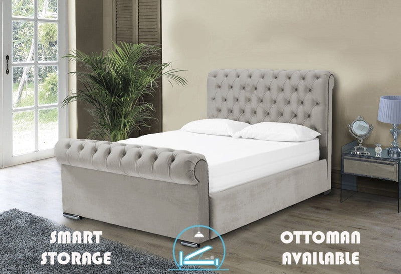 The Beautiful Benito Ottoman Bed Frame Features A Rolled Deep Buttoned Headboard & Matching Footboard Available With Diamonte Buttons Or Matching Fabric Buttons The Doubled Rolled Designed Headboard & Footboard Exudes Style & A Timeless Design Available In A Huge Variety Of Colour And Fabrics Including Chenille And Velvet Options *Also Available With A Luxury Ottoman Option, See Our Ottoman Bed Section For More*