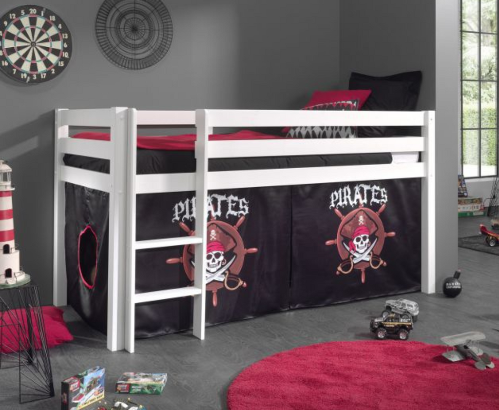 Funkie Midsleeper - White, is made of solid pine and is painted white. The ladder can be mounted on both the left and right. The slatted base is included. The all-round fall protection, wide steps and good stability make this bed very safe. The space under the bed can be used for playing or as storage space. The Funkie range offers various options to complement this bed with a desk, library, chests of drawers, hanging shelf or fun textile set.