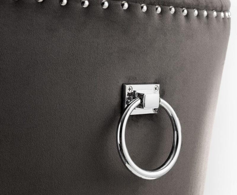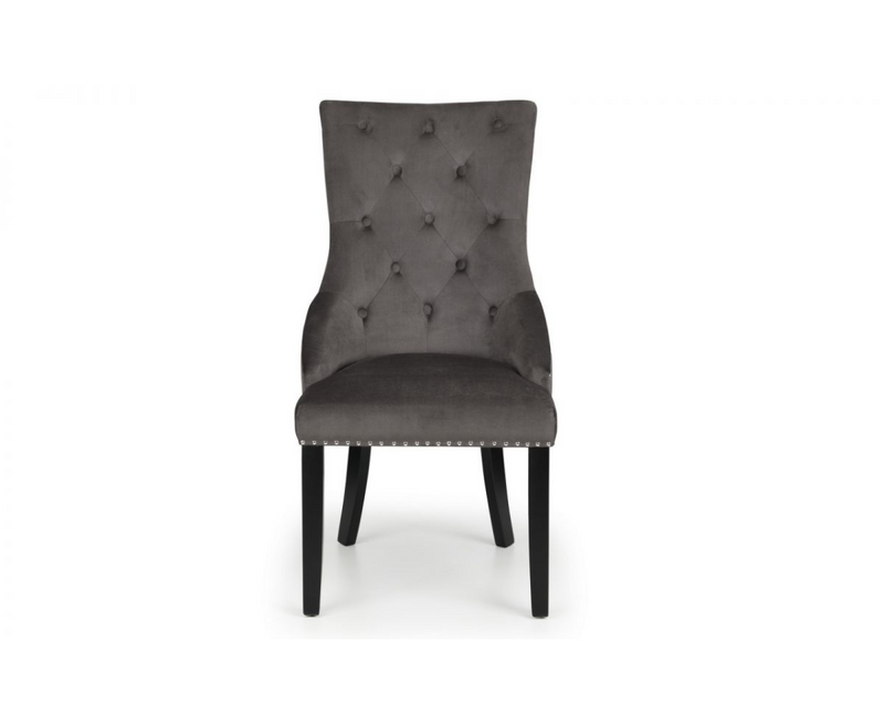 Upholstered in a soft touch luxurious grey velvet fabric, the Veniti chair has a metal ring detail on the back along with glamourous deep buttoning and a metal stud trim. Finished with sturdy black lacquered legs, this chair is perfect as a statement standalone or as part of a dining set