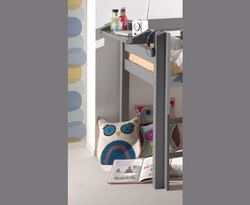 This Funkie low-sleeper is grey lacquered and made of solid Scandinavian pine wood. The slatted base is included and is suitable for a mattress of 90 x 200 cm. The space between the bed and the ground is 41.5 cm.
