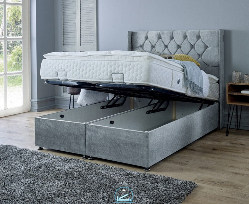 Our Marlon Luxury Ottoman Storage Bed Frame Features A Buttoned Headboard Which Sits Beautifully to the Floor With Side Panels In Matching Upholstery Each Bed Is Available In A Variety Of Different Colours And Fabrics All In The Latest On Trend Fashion Finishes, With A Luxury Ottoman Installed To Solve All You Storage Needs, We Can Also Offer An Option For You To Choose Fabric Buttons Or Diamante Buttons To Suit Your Individual Room Style