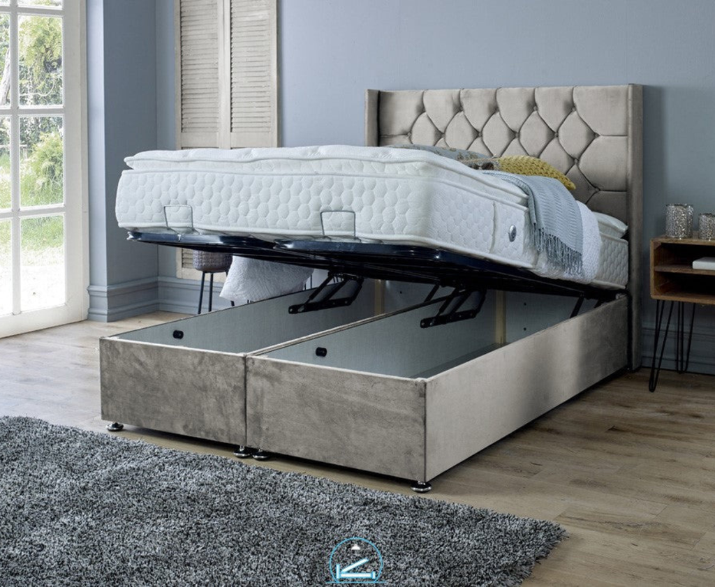 Our Marlon Luxury Ottoman Storage Bed Frame Features A Buttoned Headboard Which Sits Beautifully to the Floor With Side Panels In Matching Upholstery Each Bed Is Available In A Variety Of Different Colours And Fabrics All In The Latest On Trend Fashion Finishes, With A Luxury Ottoman Installed To Solve All You Storage Needs, We Can Also Offer An Option For You To Choose Fabric Buttons Or Diamante Buttons To Suit Your Individual Room Style