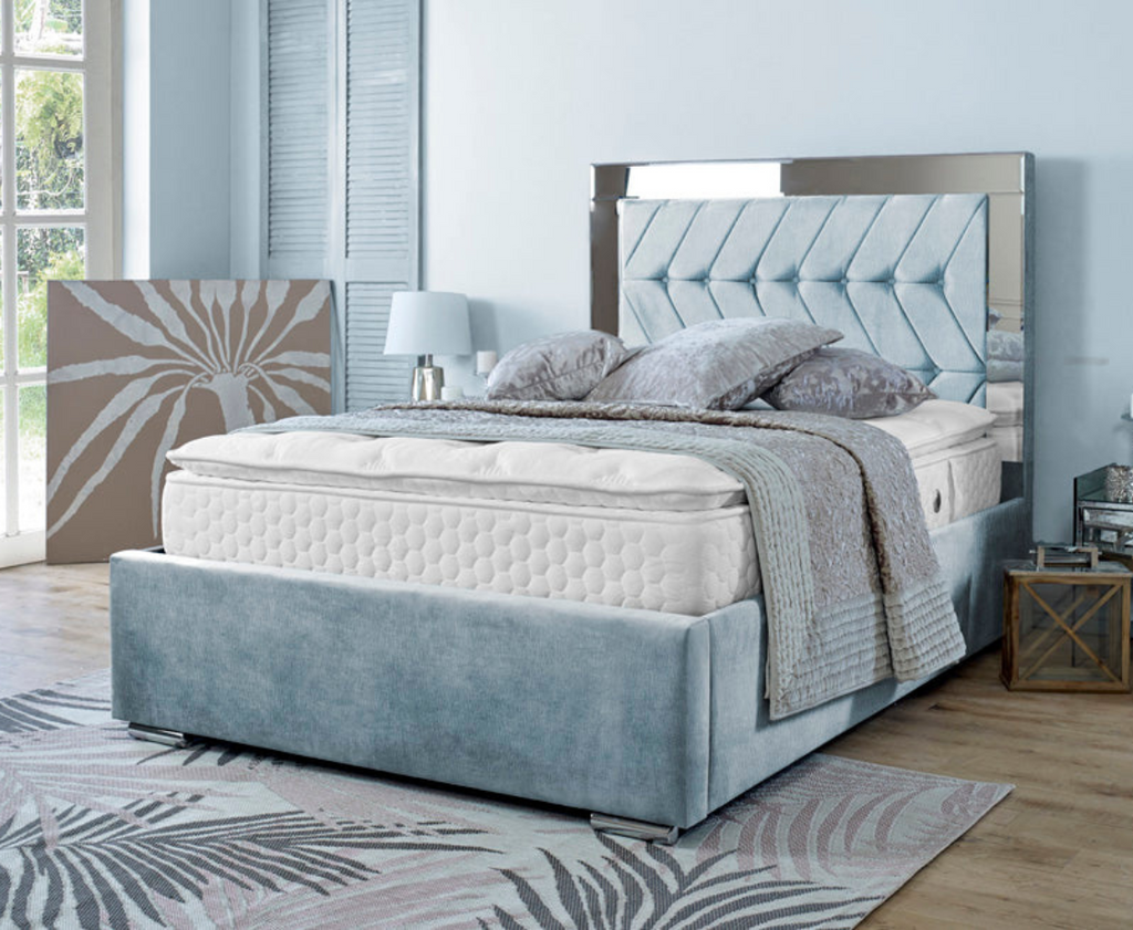 Our Exclusive Parié Standard Bed Frame Is Part Of Our New La Glance Mirrored Bed Frame Range With An Exquisite Inlayed Mirrored Panel & Deep Button Chevron Headboard The Parié Takes Inspiration From The Classic Art Deco Period Of Exploration In Design Each Panel Is Individually Upholstered To The Highest Standards To Create This Timeless Styled Bed Frame Available with Fabric Or Diamte Buttons With The Added Luxury Of A Storage Ottoman To Complete The Look