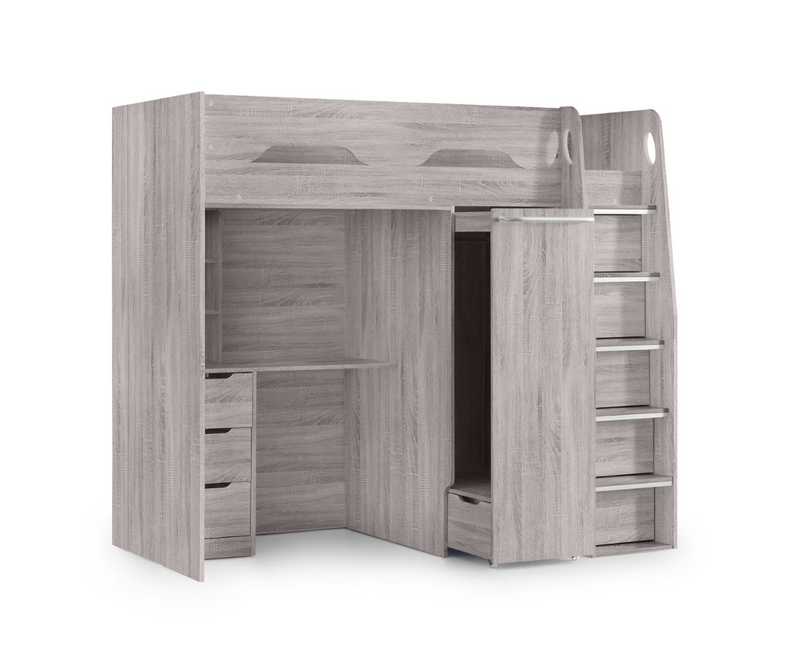 The Pegasus High Sleeper is the ultimate in functional bedroom furniture for kids and teenagers. Finished in timeless matt white with silver-grey accents, Pegasus features an incredibly practical pull-out wardrobe with integral storage drawer, which really maximises the space available within its compact footprint. The robust desk includes further storage drawers and cable holes and there is ample headroom for even the tallest kids to work in comfort. The robust ladder includes further hidden handy storage cupboards at every step.